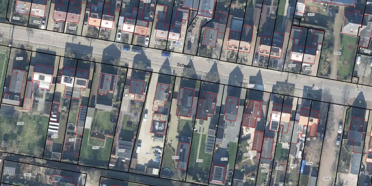 Het perceel waarop Schras 47 staat heeft een oppervlakte van 770 m². Dit is een groot perceel. De perceeloppervlakte wordt geregistreerd door het Kadaster. Gedetailleerde informatie over de maten van dit perceel kunt u vinden in het rapport Kadastrale kaart met maatvoering van Schras 47.