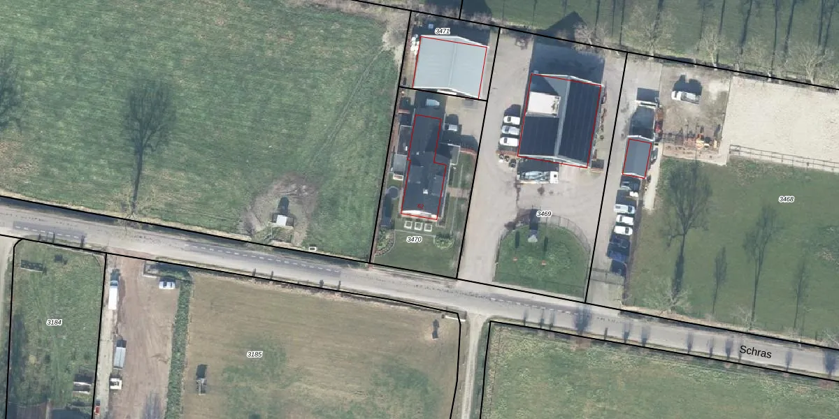 Het perceel waarop Schras 62 staat heeft een oppervlakte van 895 m². Dit is een groot perceel. De perceeloppervlakte wordt geregistreerd door het Kadaster. Gedetailleerde informatie over de maten van dit perceel kunt u vinden in het rapport Kadastrale kaart met maatvoering van Schras 62.