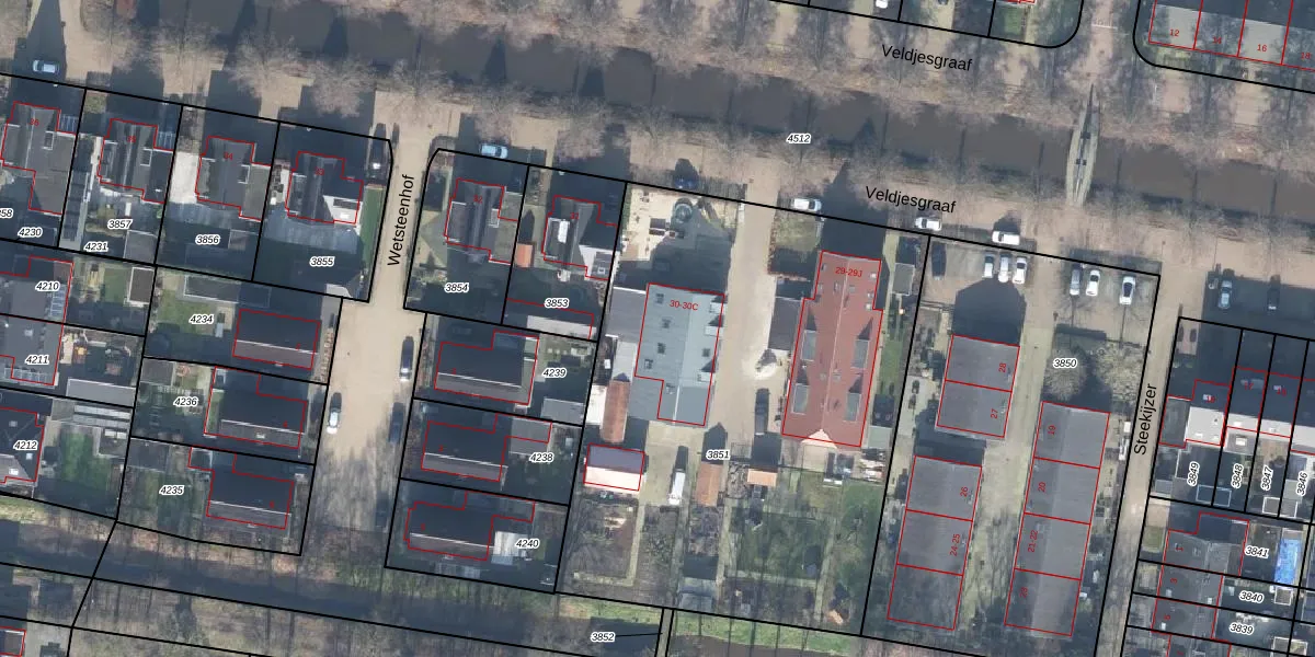 Veldjesgraaf 30-B is gelegen op kadastraal perceel EDE01H3851. Deze kadastrale aanduiding is uniek en wordt gebruikt door het Kadaster om eigendomsrechten en andere zakelijke rechten vast te leggen. Het perceel maakt onderdeel uit van de kadastrale gemeente Ede.