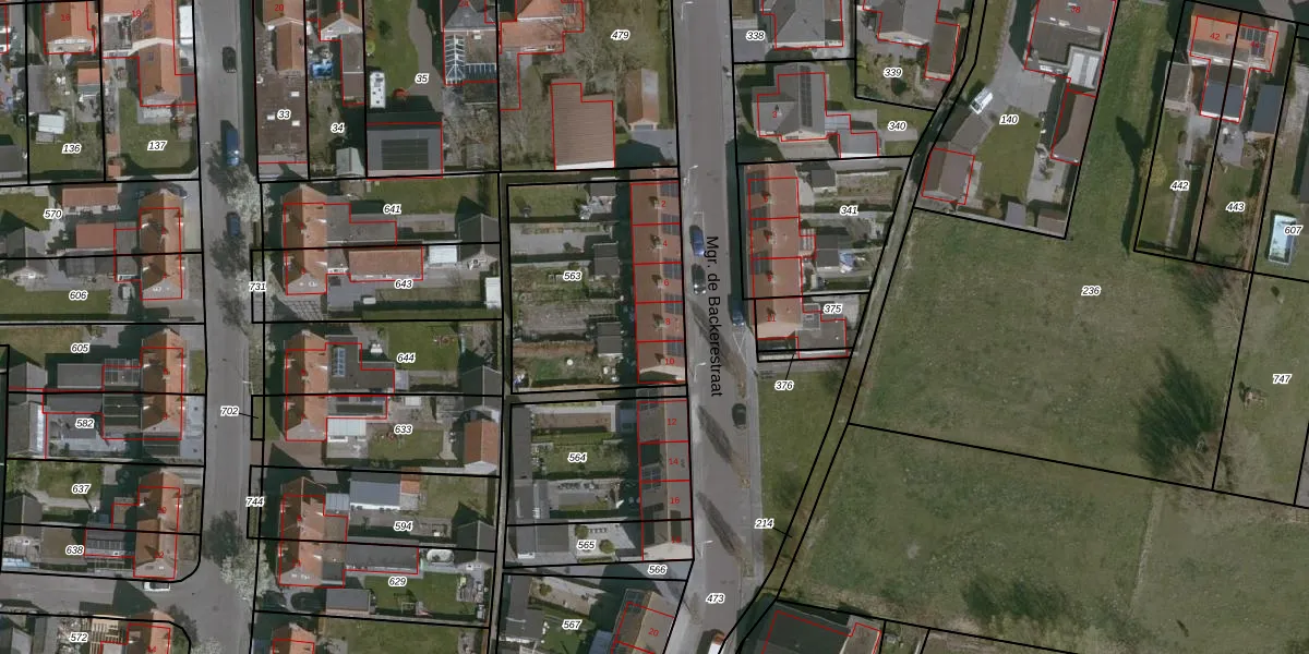 Mgr. de Backerestraat 8 is gelegen op kadastraal perceel ADB00F563. Deze kadastrale aanduiding is uniek en wordt gebruikt door het Kadaster om eigendomsrechten en andere zakelijke rechten vast te leggen. Het perceel maakt onderdeel uit van de kadastrale gemeente Aardenburg.