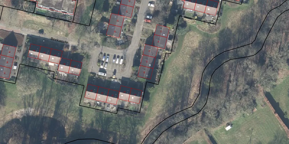 Het perceel waarop Beekweide 25 staat heeft een oppervlakte van 1,1 ha. Dit is een zeer groot perceel. De perceeloppervlakte wordt geregistreerd door het Kadaster. Gedetailleerde informatie over de maten van dit perceel kunt u vinden in het rapport Kadastrale kaart met maatvoering van Beekweide 25.