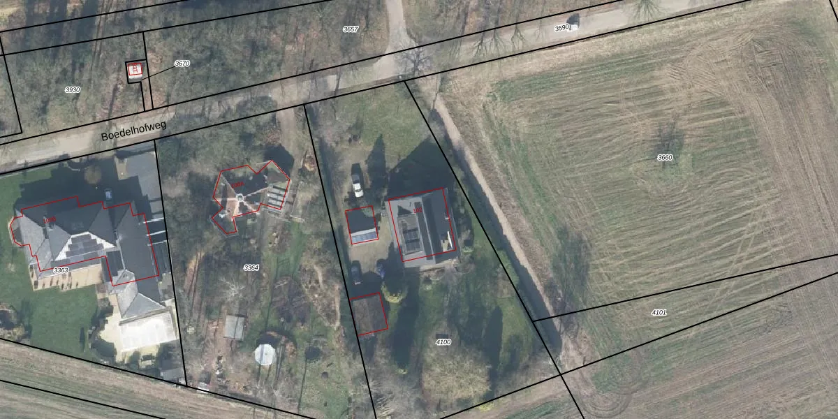 Boedelhofweg 102 is gelegen op kadastraal perceel GSL01D4100. Deze kadastrale aanduiding is uniek en wordt gebruikt door het Kadaster om eigendomsrechten en andere zakelijke rechten vast te leggen. Het perceel maakt onderdeel uit van de kadastrale gemeente Gorssel.