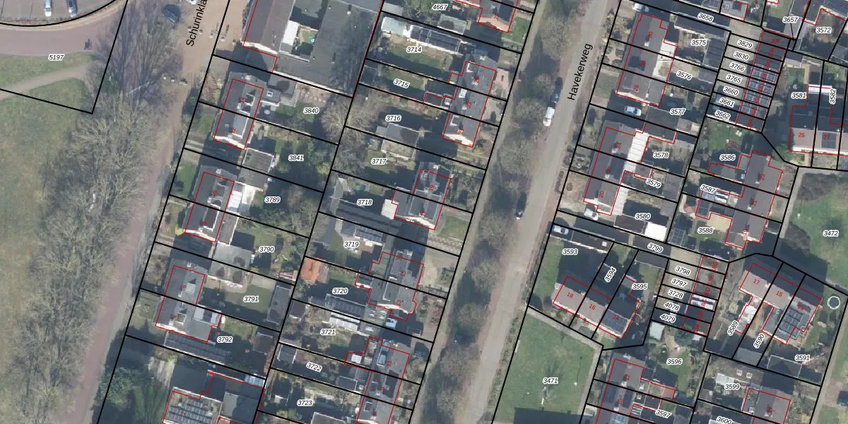 Het perceel waarop Havekerweg 17 staat heeft een oppervlakte van 367 m². Dit is een groot perceel. De perceeloppervlakte wordt geregistreerd door het Kadaster. Gedetailleerde informatie over de maten van dit perceel kunt u vinden in het rapport Kadastrale kaart met maatvoering van Havekerweg 17.