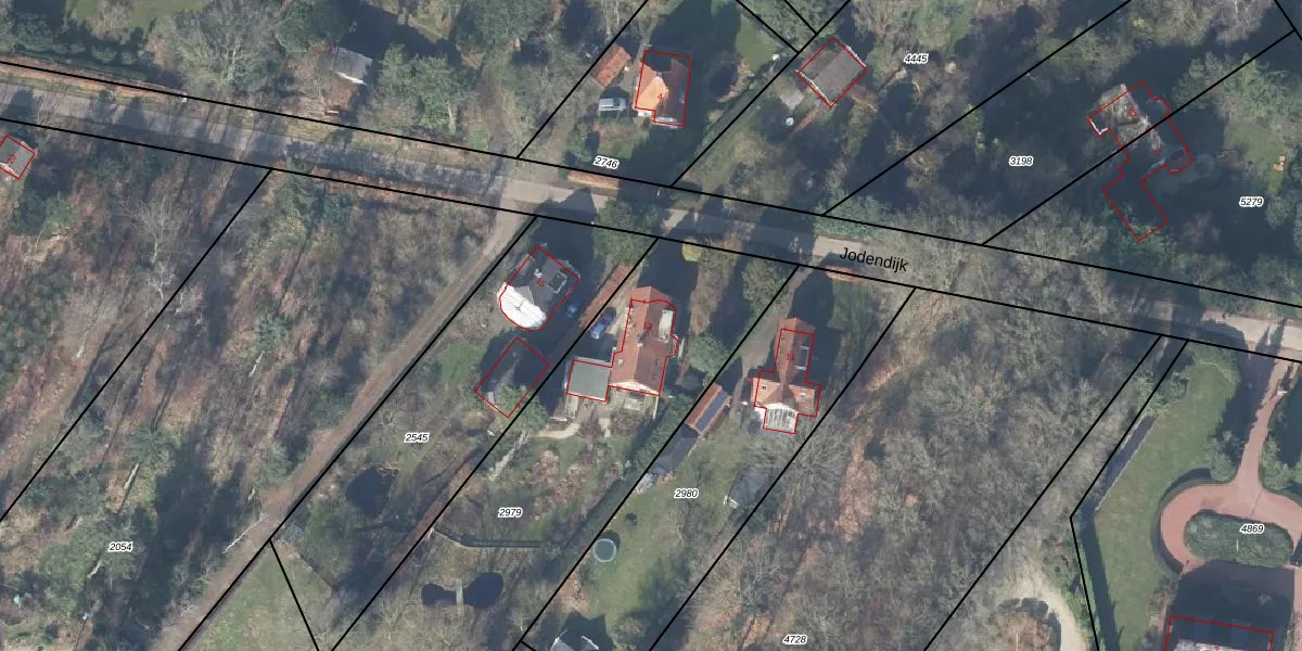 Het perceel waarop Jodendijk 13 staat heeft een oppervlakte van 2040 m². Dit is een zeer groot perceel. De perceeloppervlakte wordt geregistreerd door het Kadaster. Gedetailleerde informatie over de maten van dit perceel kunt u vinden in het rapport Kadastrale kaart met maatvoering van Jodendijk 13.