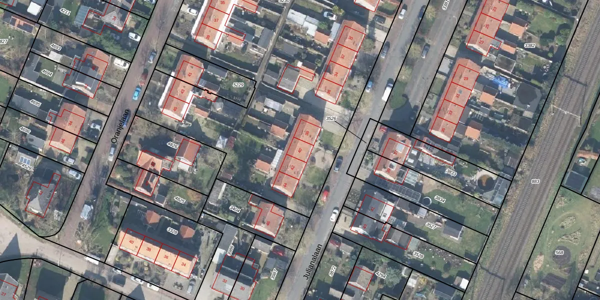 Het perceel waarop Julianalaan 40 staat heeft een oppervlakte van 1,0 ha. Dit is een zeer groot perceel. De perceeloppervlakte wordt geregistreerd door het Kadaster. Gedetailleerde informatie over de maten van dit perceel kunt u vinden in het rapport Kadastrale kaart met maatvoering van Julianalaan 40.