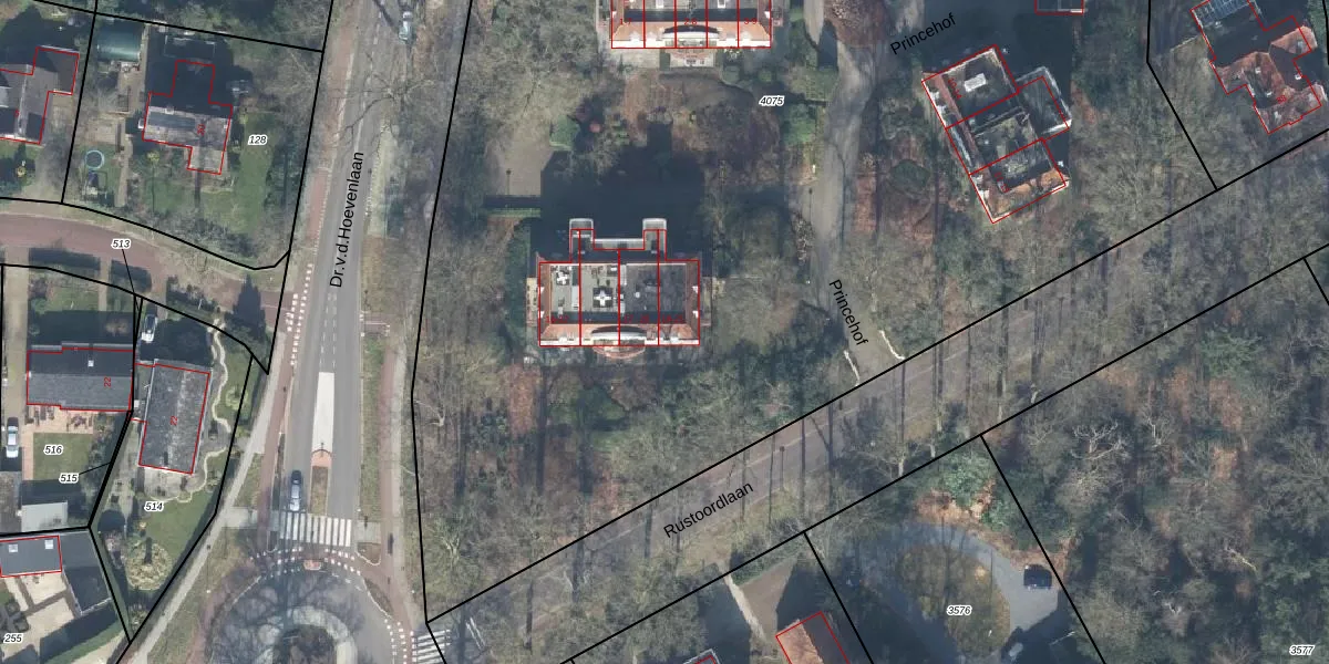 Het perceel waarop Princehof 18 staat heeft een oppervlakte van 9407 m². Dit is een zeer groot perceel. De perceeloppervlakte wordt geregistreerd door het Kadaster. Gedetailleerde informatie over de maten van dit perceel kunt u vinden in het rapport Kadastrale kaart met maatvoering van Princehof 18.