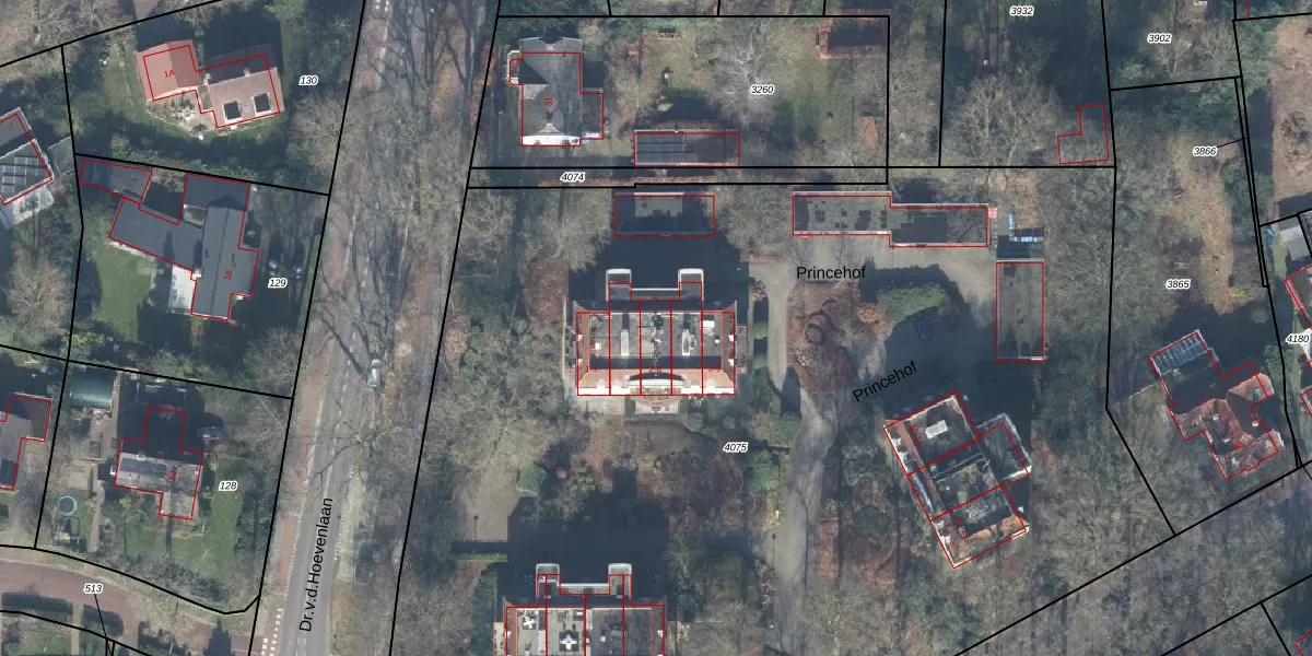 Het perceel waarop Princehof 8 staat heeft een oppervlakte van 9407 m². Dit is een zeer groot perceel. De perceeloppervlakte wordt geregistreerd door het Kadaster. Gedetailleerde informatie over de maten van dit perceel kunt u vinden in het rapport Kadastrale kaart met maatvoering van Princehof 8.