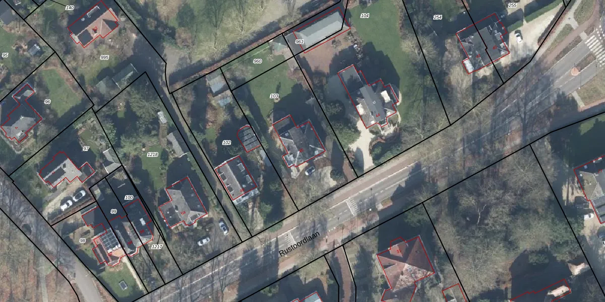 Het perceel waarop Rustoordlaan 46 staat heeft een oppervlakte van 1040 m². Dit is een zeer groot perceel. De perceeloppervlakte wordt geregistreerd door het Kadaster. Gedetailleerde informatie over de maten van dit perceel kunt u vinden in het rapport Kadastrale kaart met maatvoering van Rustoordlaan 46.