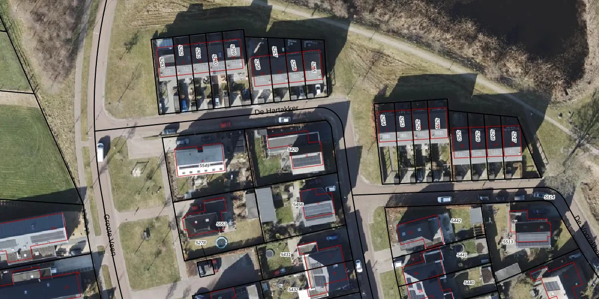 Het perceel waarop De Hartakker 3 staat heeft een oppervlakte van 536 m². Dit is een groot perceel. De perceeloppervlakte wordt geregistreerd door het Kadaster. Gedetailleerde informatie over de maten van dit perceel kunt u vinden in het rapport Kadastrale kaart met maatvoering van De Hartakker 3.