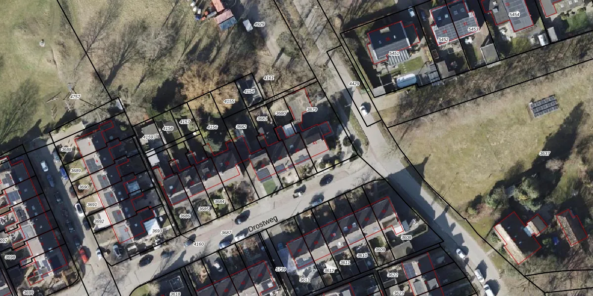 Het perceel waarop Drostweg 39 staat heeft een oppervlakte van 179 m². Dit is een middelgroot perceel. De perceeloppervlakte wordt geregistreerd door het Kadaster. Gedetailleerde informatie over de maten van dit perceel kunt u vinden in het rapport Kadastrale kaart met maatvoering van Drostweg 39.