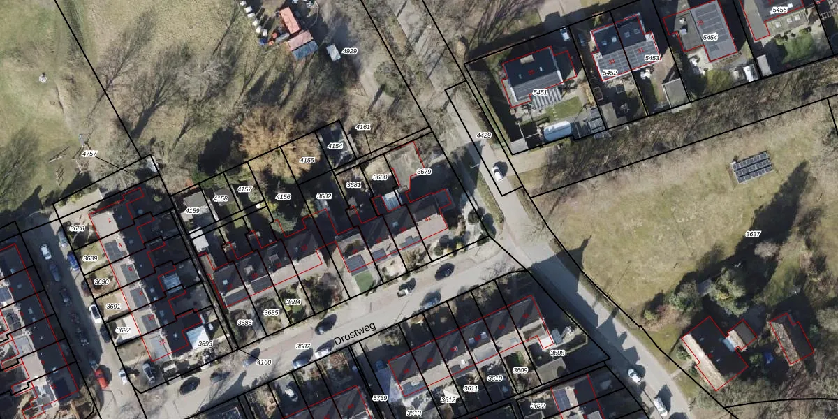 Het perceel waarop Drostweg 41 staat heeft een oppervlakte van 395 m². Dit is een groot perceel. De perceeloppervlakte wordt geregistreerd door het Kadaster. Gedetailleerde informatie over de maten van dit perceel kunt u vinden in het rapport Kadastrale kaart met maatvoering van Drostweg 41.