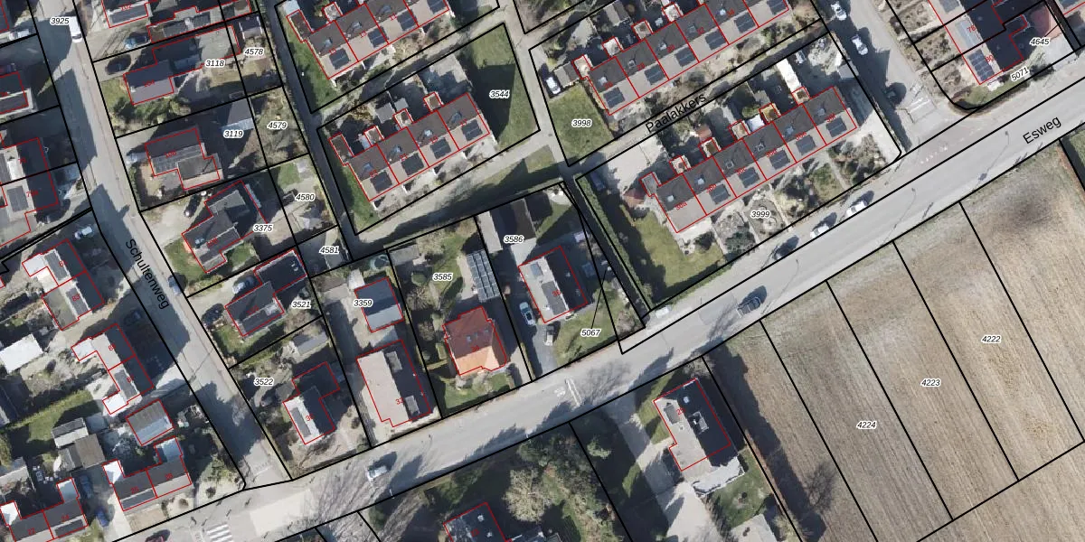 Esweg 36 is gelegen op kadastraal perceel EDE02D3586. Deze kadastrale aanduiding is uniek en wordt gebruikt door het Kadaster om eigendomsrechten en andere zakelijke rechten vast te leggen. Het perceel maakt onderdeel uit van de kadastrale gemeente Eelde.