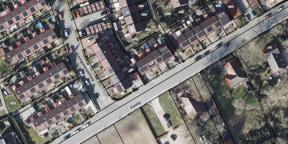 Esweg 38 is gelegen op kadastraal perceel EDE02D5087. Deze kadastrale aanduiding is uniek en wordt gebruikt door het Kadaster om eigendomsrechten en andere zakelijke rechten vast te leggen. Het perceel maakt onderdeel uit van de kadastrale gemeente Eelde.