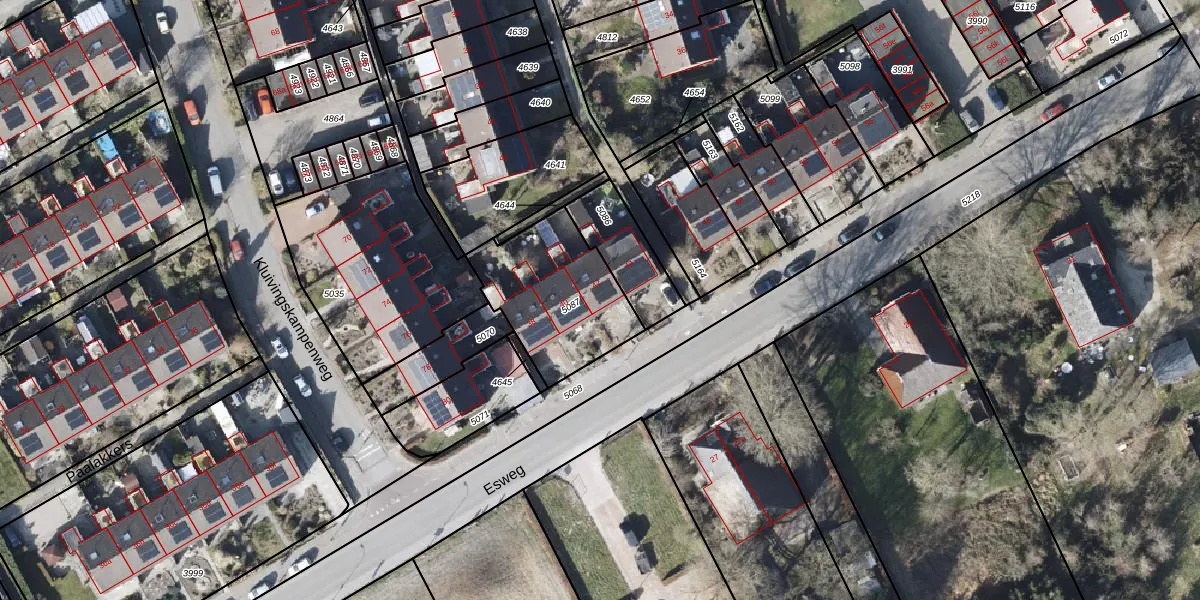 Het perceel waarop Esweg 42 staat heeft een oppervlakte van 473 m². Dit is een groot perceel. De perceeloppervlakte wordt geregistreerd door het Kadaster. Gedetailleerde informatie over de maten van dit perceel kunt u vinden in het rapport Kadastrale kaart met maatvoering van Esweg 42.