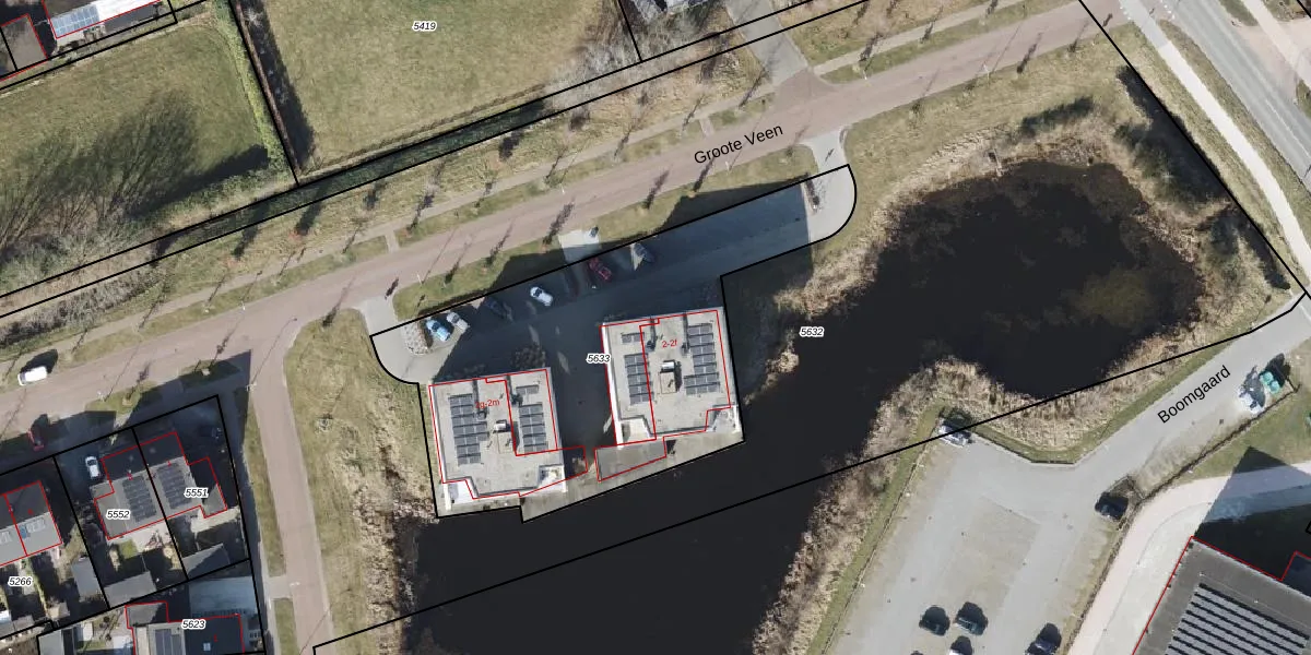 Het perceel waarop Groote Veen 2 staat heeft een oppervlakte van 1895 m². Dit is een zeer groot perceel. De perceeloppervlakte wordt geregistreerd door het Kadaster. Gedetailleerde informatie over de maten van dit perceel kunt u vinden in het rapport Kadastrale kaart met maatvoering van Groote Veen 2.