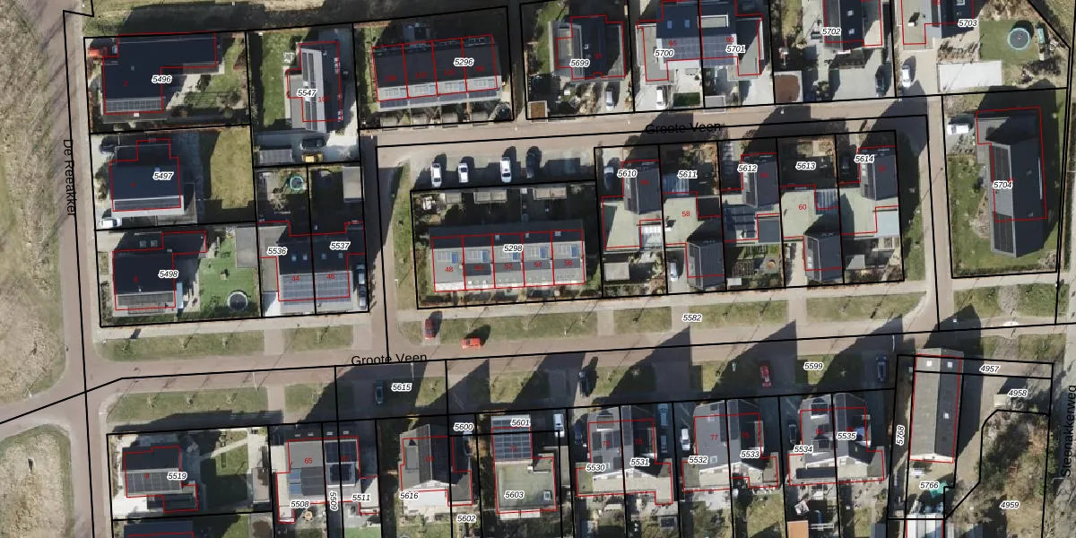 Het perceel waarop Groote Veen 54 staat heeft een oppervlakte van 759 m². Dit is een groot perceel. De perceeloppervlakte wordt geregistreerd door het Kadaster. Gedetailleerde informatie over de maten van dit perceel kunt u vinden in het rapport Kadastrale kaart met maatvoering van Groote Veen 54.