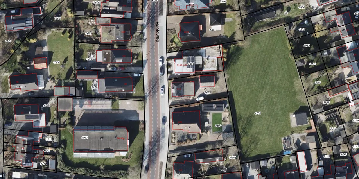 Het perceel waarop Hoofdweg 111 staat heeft een oppervlakte van 488 m². Dit is een groot perceel. De perceeloppervlakte wordt geregistreerd door het Kadaster. Gedetailleerde informatie over de maten van dit perceel kunt u vinden in het rapport Kadastrale kaart met maatvoering van Hoofdweg 111.