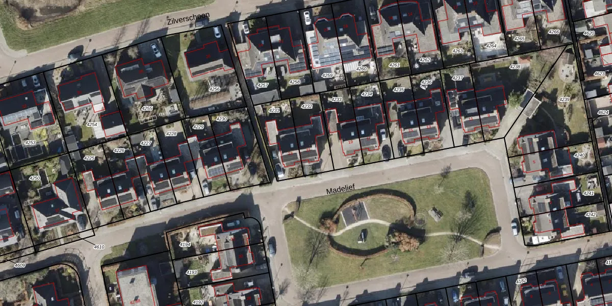Het perceel waarop Madelief 21 staat heeft een oppervlakte van 259 m². Dit is een middelgroot perceel. De perceeloppervlakte wordt geregistreerd door het Kadaster. Gedetailleerde informatie over de maten van dit perceel kunt u vinden in het rapport Kadastrale kaart met maatvoering van Madelief 21.