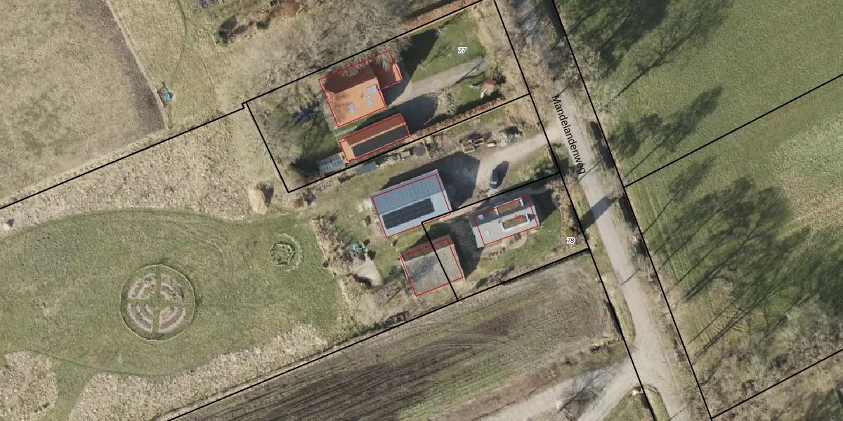Het perceel waarop Mandelandenweg 5-a-2 staat heeft een oppervlakte van 1,3 ha. Dit is een zeer groot perceel. De perceeloppervlakte wordt geregistreerd door het Kadaster. Gedetailleerde informatie over de maten van dit perceel kunt u vinden in het rapport Kadastrale kaart met maatvoering van Mandelandenweg 5-a-2.