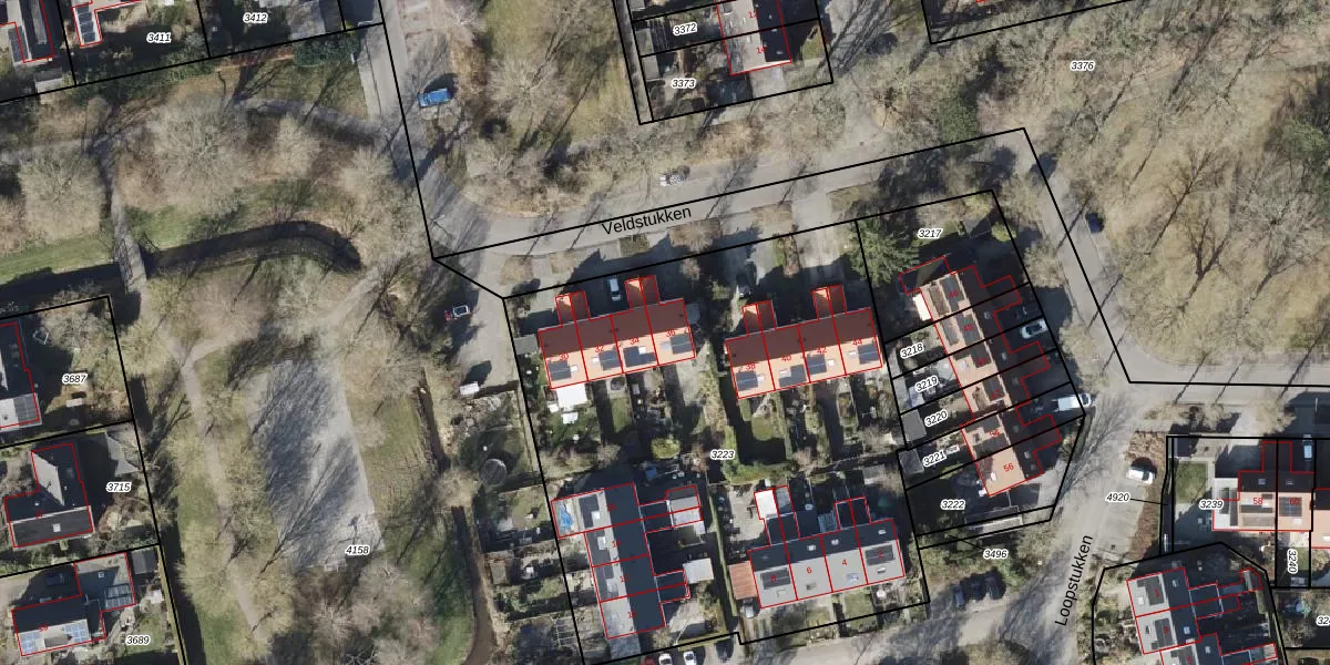 Veldstukken 36 is gelegen op kadastraal perceel EDE02E3223. Deze kadastrale aanduiding is uniek en wordt gebruikt door het Kadaster om eigendomsrechten en andere zakelijke rechten vast te leggen. Het perceel maakt onderdeel uit van de kadastrale gemeente Eelde.