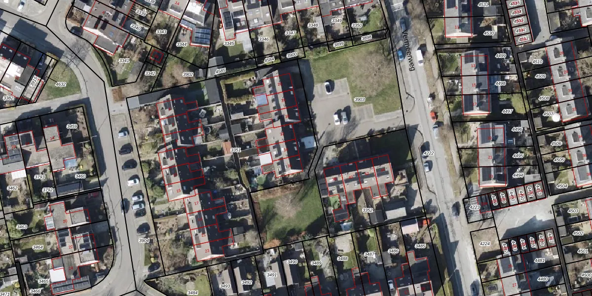 Het perceel waarop Vermeerweg 34 staat heeft een oppervlakte van 3089 m². Dit is een zeer groot perceel. De perceeloppervlakte wordt geregistreerd door het Kadaster. Gedetailleerde informatie over de maten van dit perceel kunt u vinden in het rapport Kadastrale kaart met maatvoering van Vermeerweg 34.