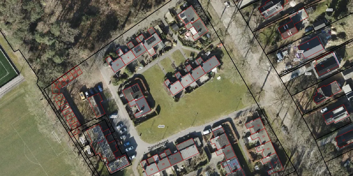 Het perceel waarop Zonnehorst 6 staat heeft een oppervlakte van 1,1 ha. Dit is een zeer groot perceel. De perceeloppervlakte wordt geregistreerd door het Kadaster. Gedetailleerde informatie over de maten van dit perceel kunt u vinden in het rapport Kadastrale kaart met maatvoering van Zonnehorst 6.