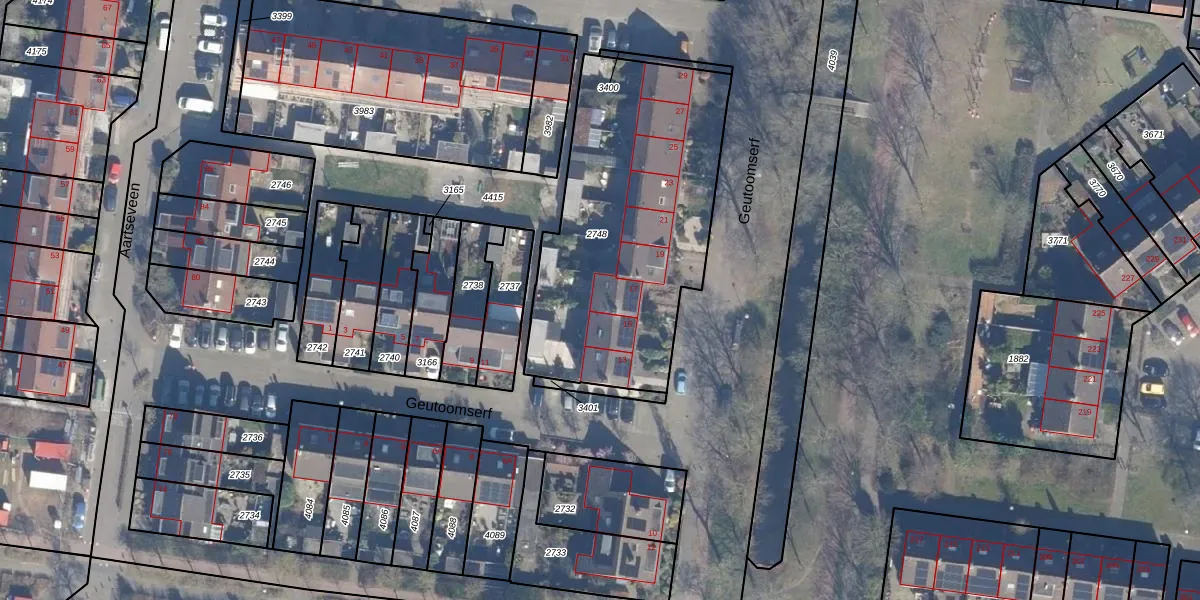 Het perceel waarop Geutoomserf 17 staat heeft een oppervlakte van 1355 m². Dit is een zeer groot perceel. De perceeloppervlakte wordt geregistreerd door het Kadaster. Gedetailleerde informatie over de maten van dit perceel kunt u vinden in het rapport Kadastrale kaart met maatvoering van Geutoomserf 17.