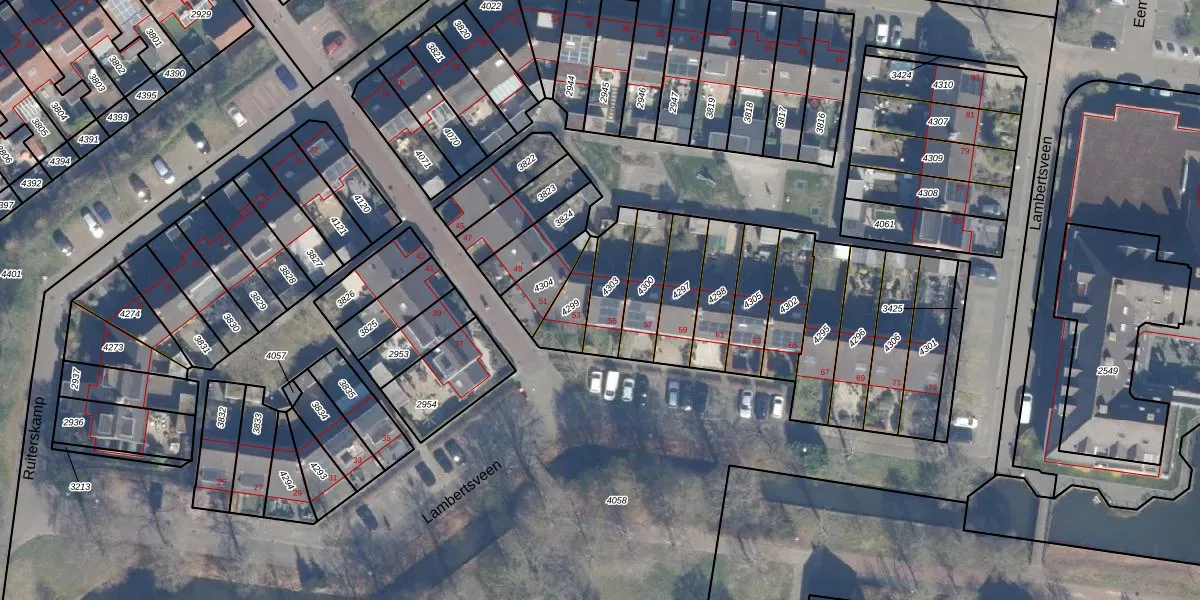 Lambertsveen 55 is gelegen op kadastraal perceel ENS00A4303. Deze kadastrale aanduiding is uniek en wordt gebruikt door het Kadaster om eigendomsrechten en andere zakelijke rechten vast te leggen. Het perceel maakt onderdeel uit van de kadastrale gemeente Eemnes.