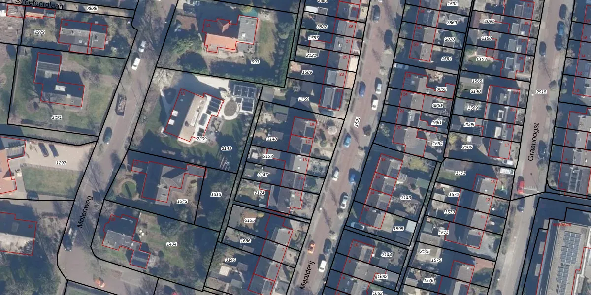 Het perceel waarop Maalderij 17 staat heeft een oppervlakte van 416 m². Dit is een groot perceel. De perceeloppervlakte wordt geregistreerd door het Kadaster. Gedetailleerde informatie over de maten van dit perceel kunt u vinden in het rapport Kadastrale kaart met maatvoering van Maalderij 17.