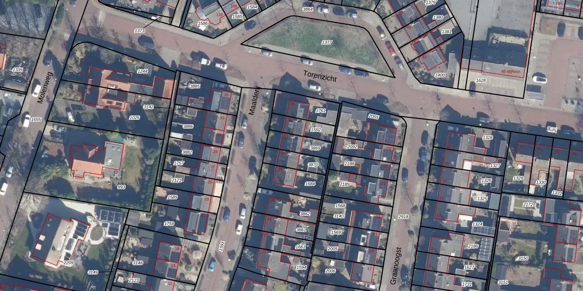 Het perceel waarop Maalderij 32 staat heeft een oppervlakte van 130 m². Dit is een middelgroot perceel. De perceeloppervlakte wordt geregistreerd door het Kadaster. Gedetailleerde informatie over de maten van dit perceel kunt u vinden in het rapport Kadastrale kaart met maatvoering van Maalderij 32.