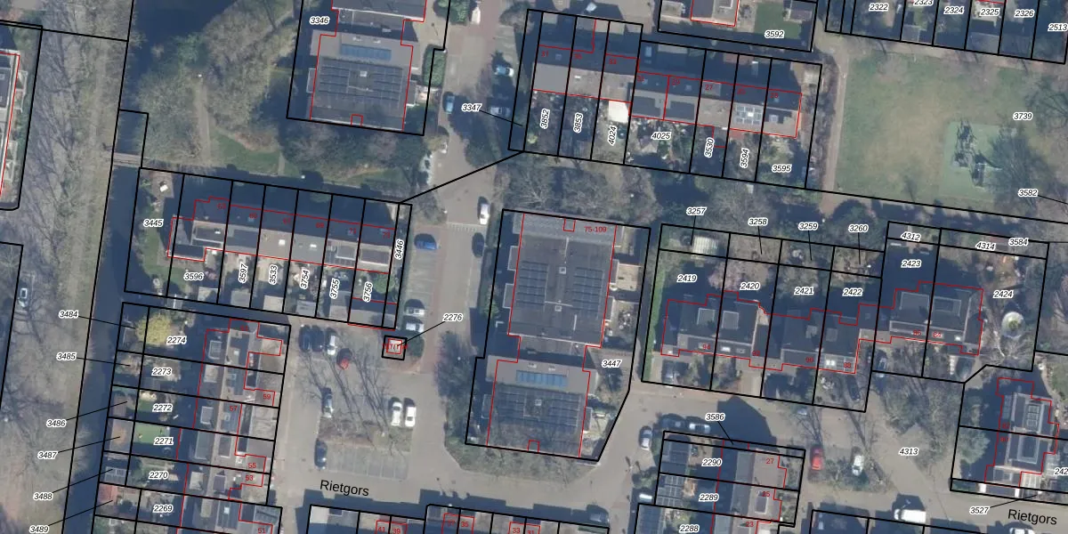 Het perceel waarop Rietgors 75 staat heeft een oppervlakte van 1230 m². Dit is een zeer groot perceel. De perceeloppervlakte wordt geregistreerd door het Kadaster. Gedetailleerde informatie over de maten van dit perceel kunt u vinden in het rapport Kadastrale kaart met maatvoering van Rietgors 75.