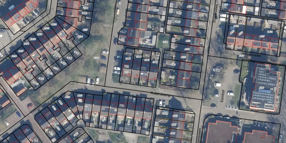 Ruiterskamp 54 is gelegen op kadastraal perceel ENS00A2987. Deze kadastrale aanduiding is uniek en wordt gebruikt door het Kadaster om eigendomsrechten en andere zakelijke rechten vast te leggen. Het perceel maakt onderdeel uit van de kadastrale gemeente Eemnes.