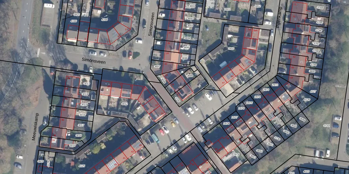 Het perceel waarop Simonsveen 18 staat heeft een oppervlakte van 121 m². Dit is een middelgroot perceel. De perceeloppervlakte wordt geregistreerd door het Kadaster. Gedetailleerde informatie over de maten van dit perceel kunt u vinden in het rapport Kadastrale kaart met maatvoering van Simonsveen 18.