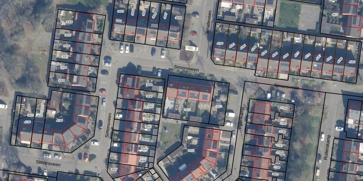 Het perceel waarop Simonsveen 42 staat heeft een oppervlakte van 615 m². Dit is een groot perceel. De perceeloppervlakte wordt geregistreerd door het Kadaster. Gedetailleerde informatie over de maten van dit perceel kunt u vinden in het rapport Kadastrale kaart met maatvoering van Simonsveen 42.