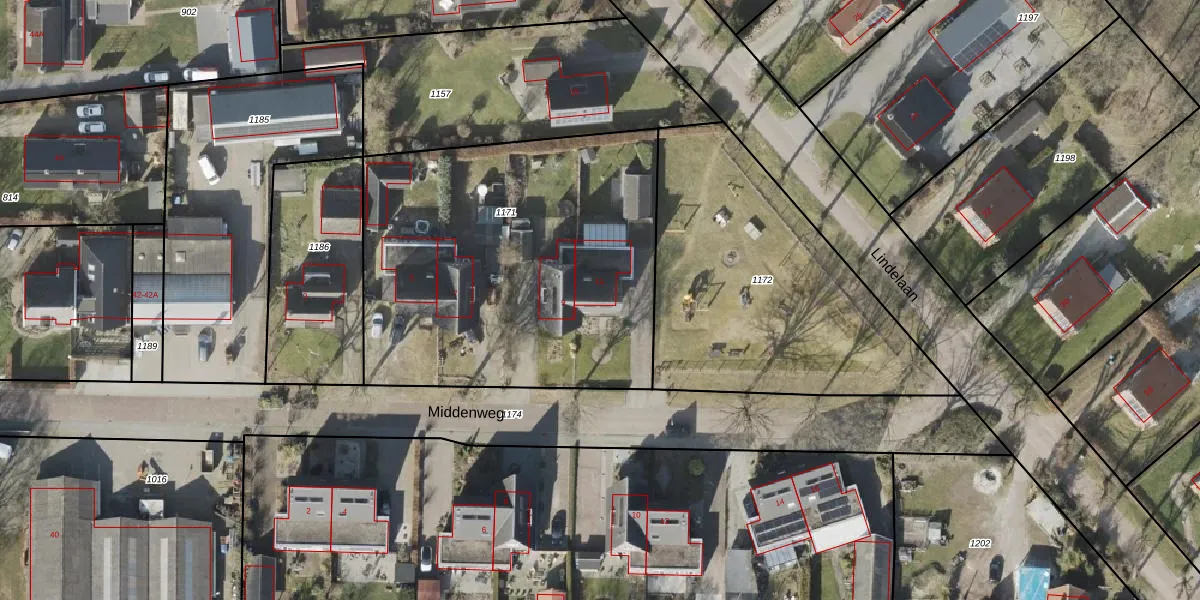 Het perceel waarop Middenweg 11 staat heeft een oppervlakte van 1955 m². Dit is een zeer groot perceel. De perceeloppervlakte wordt geregistreerd door het Kadaster. Gedetailleerde informatie over de maten van dit perceel kunt u vinden in het rapport Kadastrale kaart met maatvoering van Middenweg 11.