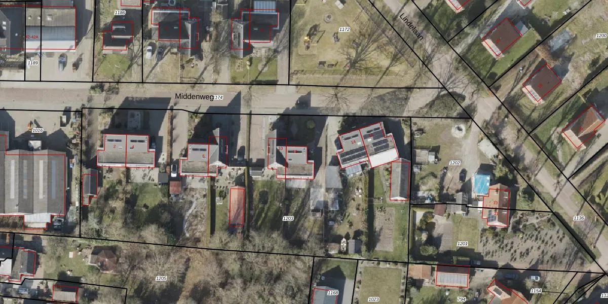 Het perceel waarop Middenweg 12 staat heeft een oppervlakte van 4915 m². Dit is een zeer groot perceel. De perceeloppervlakte wordt geregistreerd door het Kadaster. Gedetailleerde informatie over de maten van dit perceel kunt u vinden in het rapport Kadastrale kaart met maatvoering van Middenweg 12.