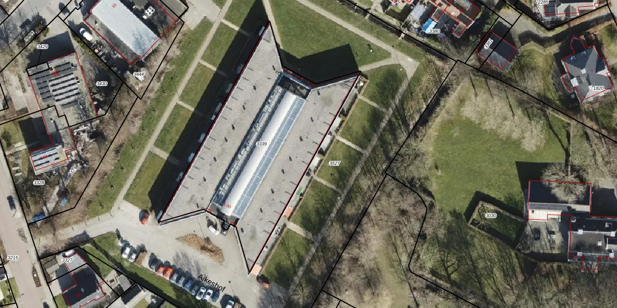 Het perceel waarop Aikeshof 3 staat heeft een oppervlakte van 2045 m². Dit is een zeer groot perceel. De perceeloppervlakte wordt geregistreerd door het Kadaster. Gedetailleerde informatie over de maten van dit perceel kunt u vinden in het rapport Kadastrale kaart met maatvoering van Aikeshof 3.