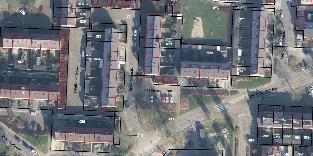 Het perceel waarop Beethovenstraat 47-A staat heeft een oppervlakte van 2805 m². Dit is een zeer groot perceel. De perceeloppervlakte wordt geregistreerd door het Kadaster. Gedetailleerde informatie over de maten van dit perceel kunt u vinden in het rapport Kadastrale kaart met maatvoering van Beethovenstraat 47-A.