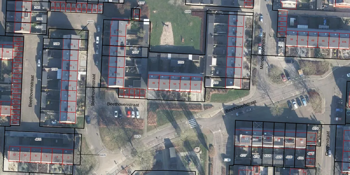 Het perceel waarop Beethovenstraat 53 staat heeft een oppervlakte van 2805 m². Dit is een zeer groot perceel. De perceeloppervlakte wordt geregistreerd door het Kadaster. Gedetailleerde informatie over de maten van dit perceel kunt u vinden in het rapport Kadastrale kaart met maatvoering van Beethovenstraat 53.