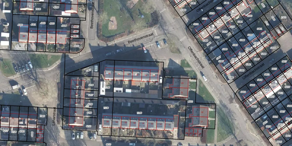 Het perceel waarop Beethovenstraat 54 staat heeft een oppervlakte van 2205 m². Dit is een zeer groot perceel. De perceeloppervlakte wordt geregistreerd door het Kadaster. Gedetailleerde informatie over de maten van dit perceel kunt u vinden in het rapport Kadastrale kaart met maatvoering van Beethovenstraat 54.