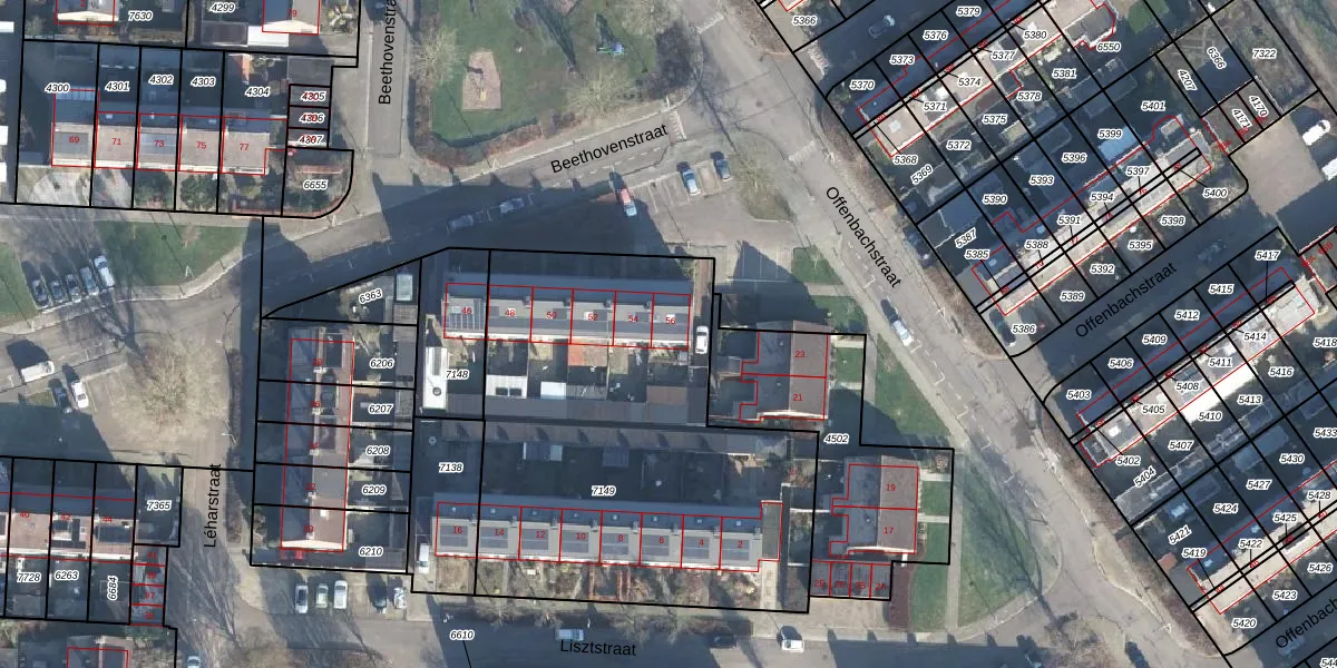 Het perceel waarop Beethovenstraat 56 staat heeft een oppervlakte van 2205 m². Dit is een zeer groot perceel. De perceeloppervlakte wordt geregistreerd door het Kadaster. Gedetailleerde informatie over de maten van dit perceel kunt u vinden in het rapport Kadastrale kaart met maatvoering van Beethovenstraat 56.