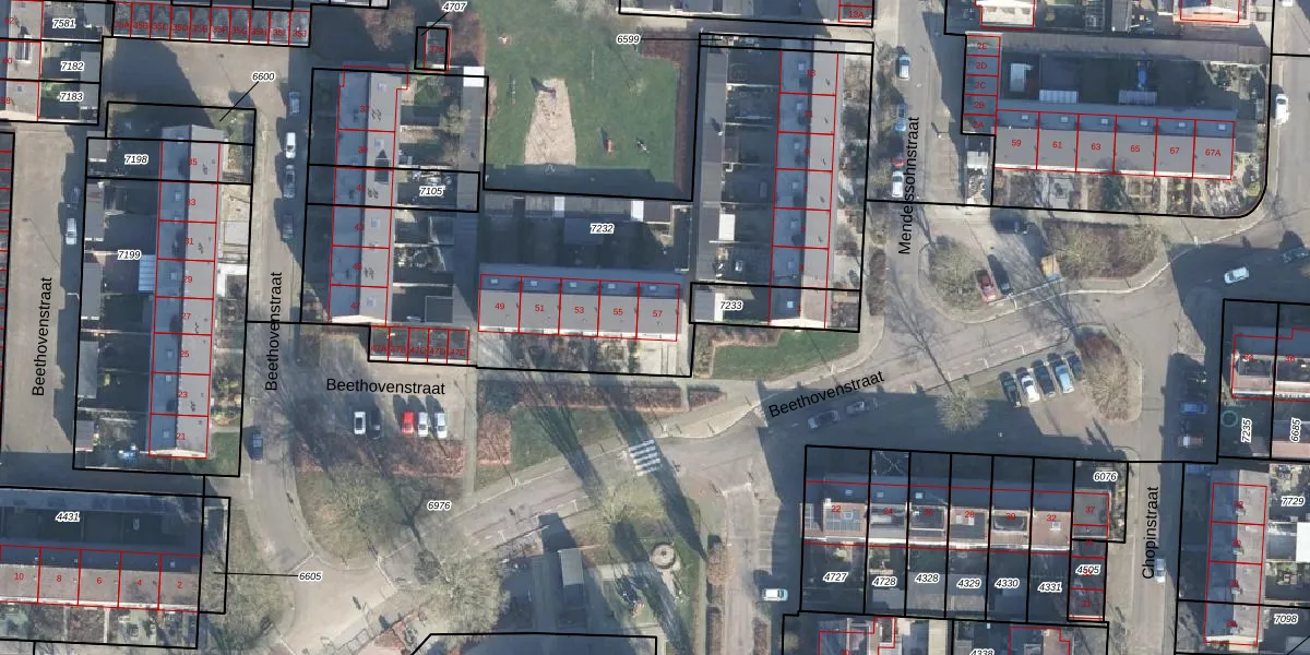 Het perceel waarop Beethovenstraat 57 staat heeft een oppervlakte van 2805 m². Dit is een zeer groot perceel. De perceeloppervlakte wordt geregistreerd door het Kadaster. Gedetailleerde informatie over de maten van dit perceel kunt u vinden in het rapport Kadastrale kaart met maatvoering van Beethovenstraat 57.