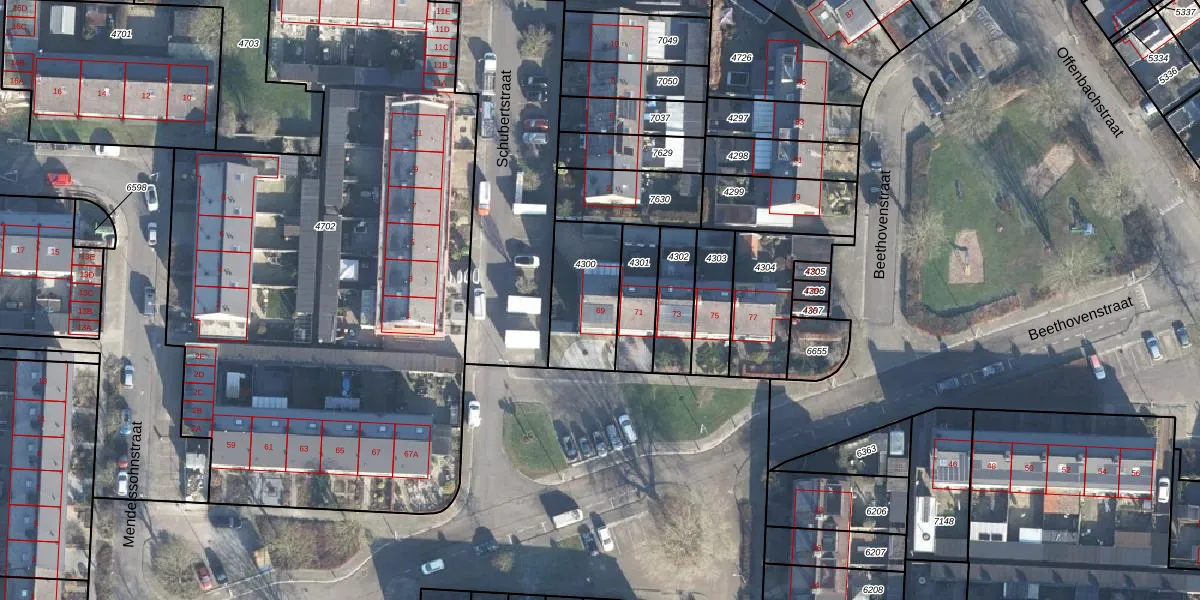 Het perceel waarop Beethovenstraat 69 staat heeft een oppervlakte van 297 m². Dit is een middelgroot perceel. De perceeloppervlakte wordt geregistreerd door het Kadaster. Gedetailleerde informatie over de maten van dit perceel kunt u vinden in het rapport Kadastrale kaart met maatvoering van Beethovenstraat 69.