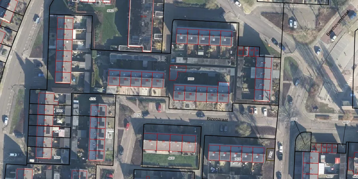Het perceel waarop Bizetstraat 33 staat heeft een oppervlakte van 4860 m². Dit is een zeer groot perceel. De perceeloppervlakte wordt geregistreerd door het Kadaster. Gedetailleerde informatie over de maten van dit perceel kunt u vinden in het rapport Kadastrale kaart met maatvoering van Bizetstraat 33.