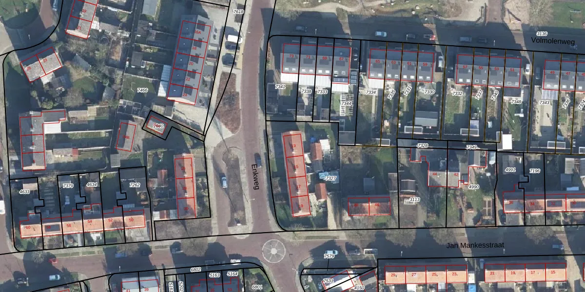 Het perceel waarop Enkweg 13 staat heeft een oppervlakte van 1492 m². Dit is een zeer groot perceel. De perceeloppervlakte wordt geregistreerd door het Kadaster. Gedetailleerde informatie over de maten van dit perceel kunt u vinden in het rapport Kadastrale kaart met maatvoering van Enkweg 13.