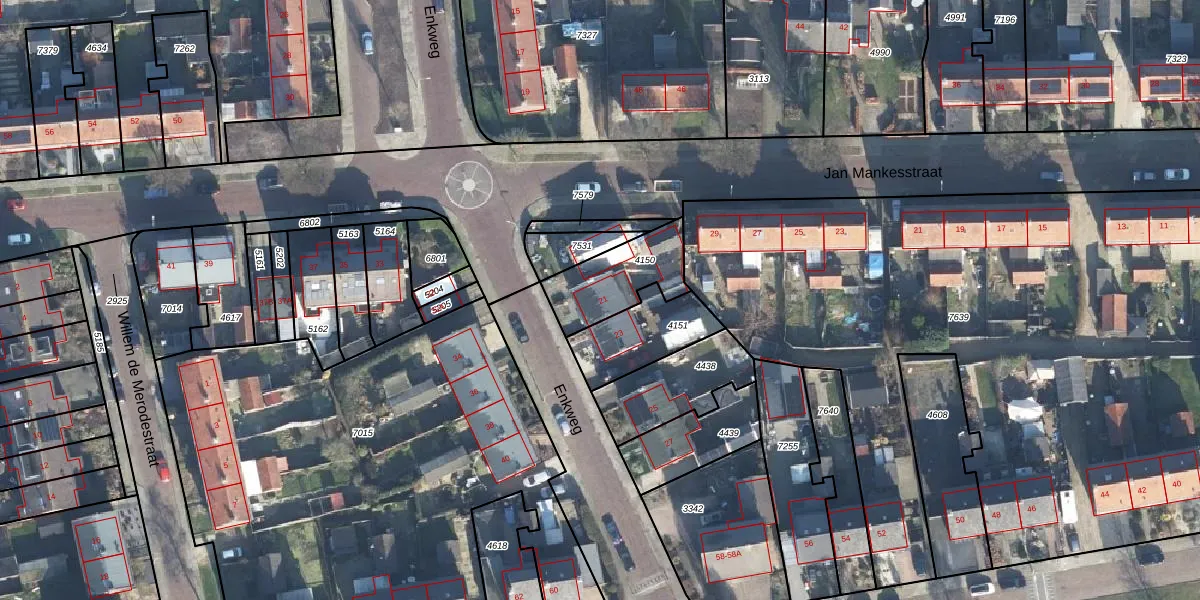 Gebruik de zoekbalk of klik op een perceel voor informatie over de adressen binnen dit perceel.