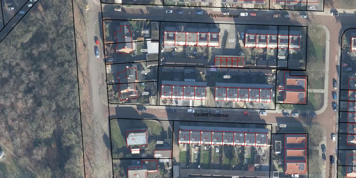 Het perceel waarop Gerard Doustraat 20 staat heeft een oppervlakte van 1516 m². Dit is een zeer groot perceel. De perceeloppervlakte wordt geregistreerd door het Kadaster. Gedetailleerde informatie over de maten van dit perceel kunt u vinden in het rapport Kadastrale kaart met maatvoering van Gerard Doustraat 20.
