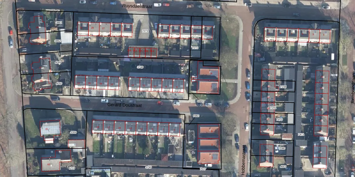 Het perceel waarop Gerard Doustraat 6 staat heeft een oppervlakte van 1516 m². Dit is een zeer groot perceel. De perceeloppervlakte wordt geregistreerd door het Kadaster. Gedetailleerde informatie over de maten van dit perceel kunt u vinden in het rapport Kadastrale kaart met maatvoering van Gerard Doustraat 6.