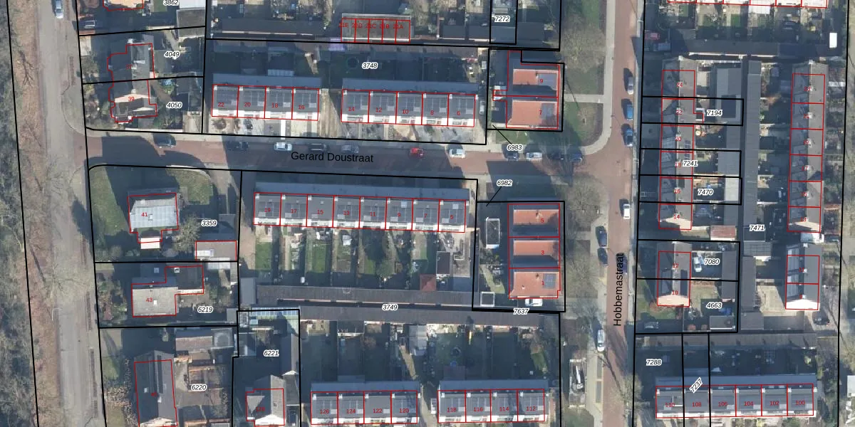 Het perceel waarop Gerard Doustraat 7 staat heeft een oppervlakte van 3649 m². Dit is een zeer groot perceel. De perceeloppervlakte wordt geregistreerd door het Kadaster. Gedetailleerde informatie over de maten van dit perceel kunt u vinden in het rapport Kadastrale kaart met maatvoering van Gerard Doustraat 7.