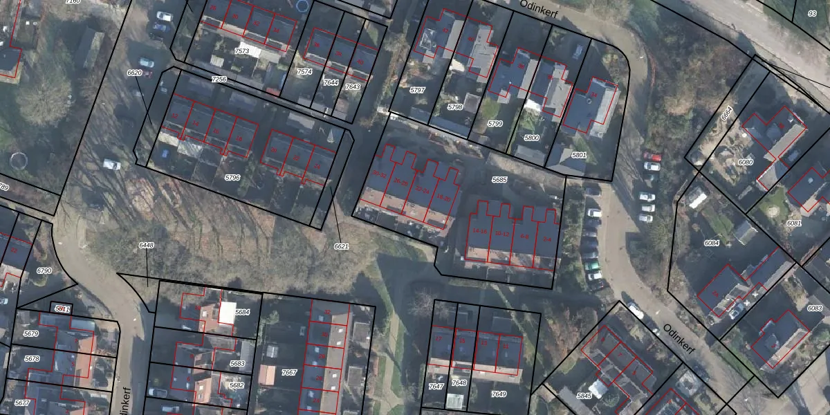 Het perceel waarop Odinkerf 24 staat heeft een oppervlakte van 1384 m². Dit is een zeer groot perceel. De perceeloppervlakte wordt geregistreerd door het Kadaster. Gedetailleerde informatie over de maten van dit perceel kunt u vinden in het rapport Kadastrale kaart met maatvoering van Odinkerf 24.